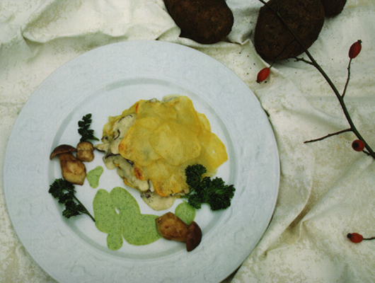 Mit Kastanien gefüllte Krautröllchen auf gebackener Kartoffelrosette, Wacholder-Rotweinsauce