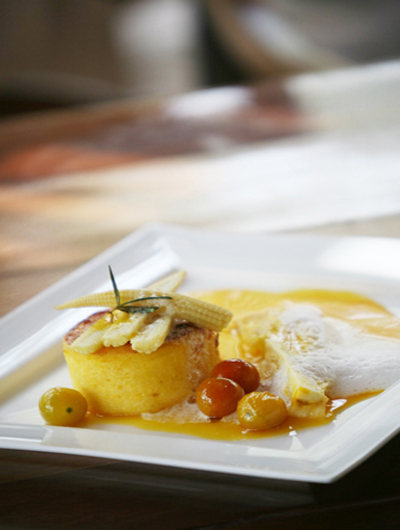 Bunte Hirseschnittchen, karamellisierter Zitronensellerie, Kräuterjus