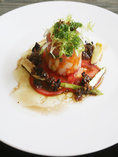 Gurkenbavaroise, Tapenade und Dillsauerrahm, Rote Rübensuppe „Borschtsch“