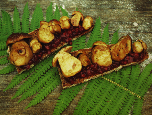 Tannenwipfelparfait, in Honig eingelegte Preiselbeeren, Walnußbusserl